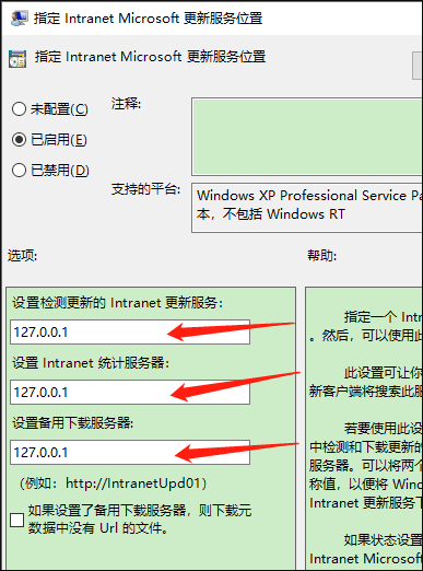 然后在下面的三个输入框(Intranet更新、统计、备用下载服务地址)均填入 127.0.0.1,如上图所示 - 运行gpedit.msc—计算机配置—管理模板—Windows组件—Windows更新—配置自动更新—禁用